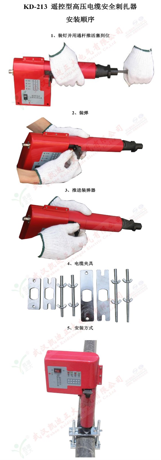 KD-213电缆安全刺扎器分为射击器和控制器两大部分:射击器前端及后端两部分由螺母3连接而成一体,通过U型卡具与电缆牢靠固定。其结构合理轻巧,安装固定方便,可多角度安装。控制器采用数字控制及电子检测电路,将真人语音与液晶显示控制于一体,实现了人机对话。整机面板设计清晰醒目、操作简单方便。电缆安全刺扎器采用遥控、线控定时两种模式,工作发射时人不直接接触设备,确保人身安全。采用电池供电,刺扎器与电力系统隔离,确保供电安全。