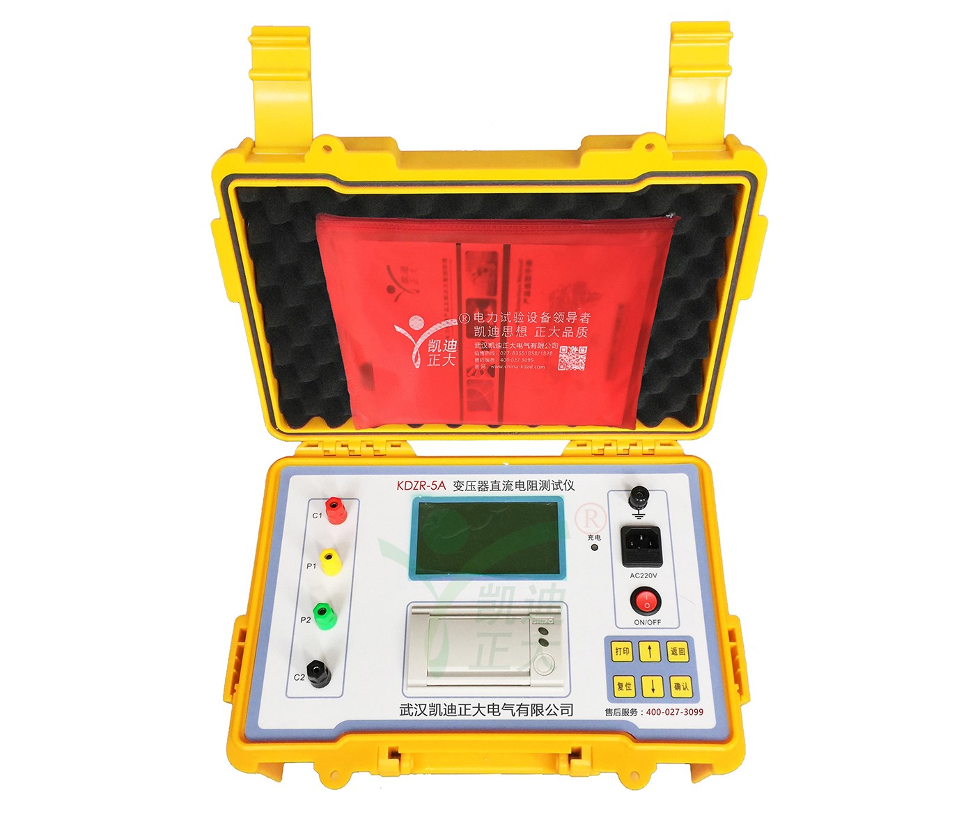 KDZR-5A 变压器直流电阻测试仪界面设计采用微机控制,大屏幕背光汉字液晶屏显示,操作简便、显示清晰人机交互界面友好,测量过程及仪器工作状态提示明确充分,不需操作人员记忆过多的规程;采用电流源线性补偿技术,测试稳定、测量精度高、速度快,提高了测量效率,减轻了操作人员的工作强度。技术上采用“四端”测量,消除引线电阻与接触引起的测量误差。有过压防护功能,能防反电动势冲击。面板式打印机可快速打印测量结果(选用)。体积小、重量轻、携带方便。